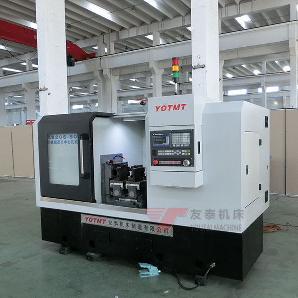 ZK8206-500铣端面打中心孔机床为平床身卧式三轴结构,采用三套数控进给工作台,两套对置的双主轴动力头,铣削主轴上装有BT50标准接口的铣刀盘,钻孔主轴上装有BT40标准的钻刀柄,钻孔主轴上还可以选装外圆套车刀盘用于钻中心孔的同时在工件轴端套车一段外圆,用于后序车床加工时夹持,可省去车床调头加工的一道工序。采用两套自定心液压虎钳,用于装夹工件,夹具可快速的根据工件长短调整夹持位置。